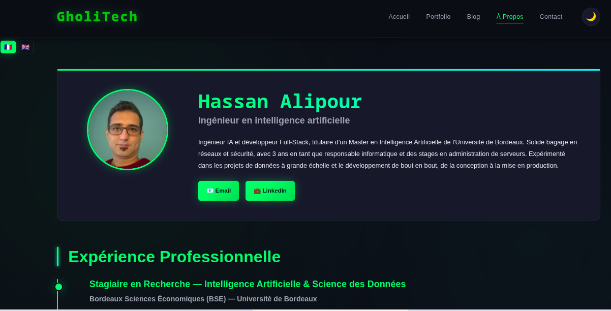 GholiTech est un site web portfolio personnel développé de A à Z avec Django 5.2. Le projet couvre l'ensemble du cycle de développement : conception, développement, déploiement et maintenance en production.