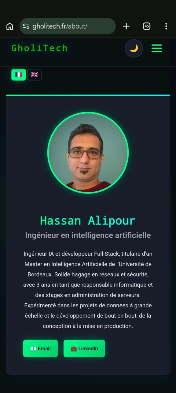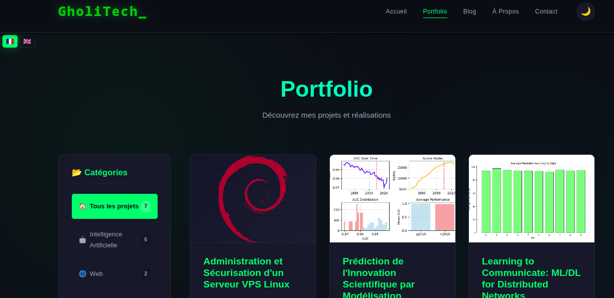 GholiTech est un site web portfolio personnel développé de A à Z avec Django 5.2. Le projet couvre l'ensemble du cycle de développement : conception, développement, déploiement et maintenance en production.